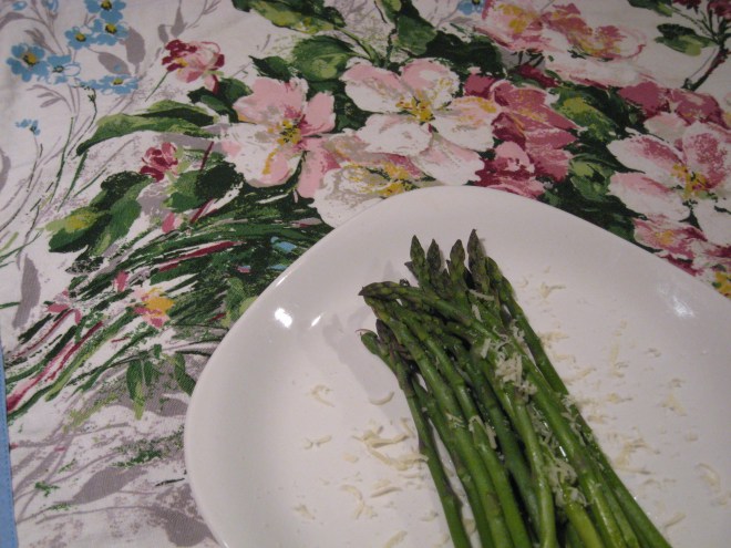 This one is so easy – just snap the woody ends off the asparagus, and steam them for a minute or two. Plate them, squeeze a little fresh lemon juice on top, grate a little parmesan on, and a little salt. Done – tasty, easy, delicious.