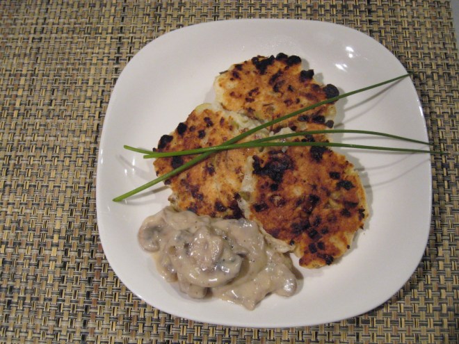 8. I like to serve them as soon as they come off the pan and eat them while they’re hot. Top with the mushroom sauce and a little grated parmesan.