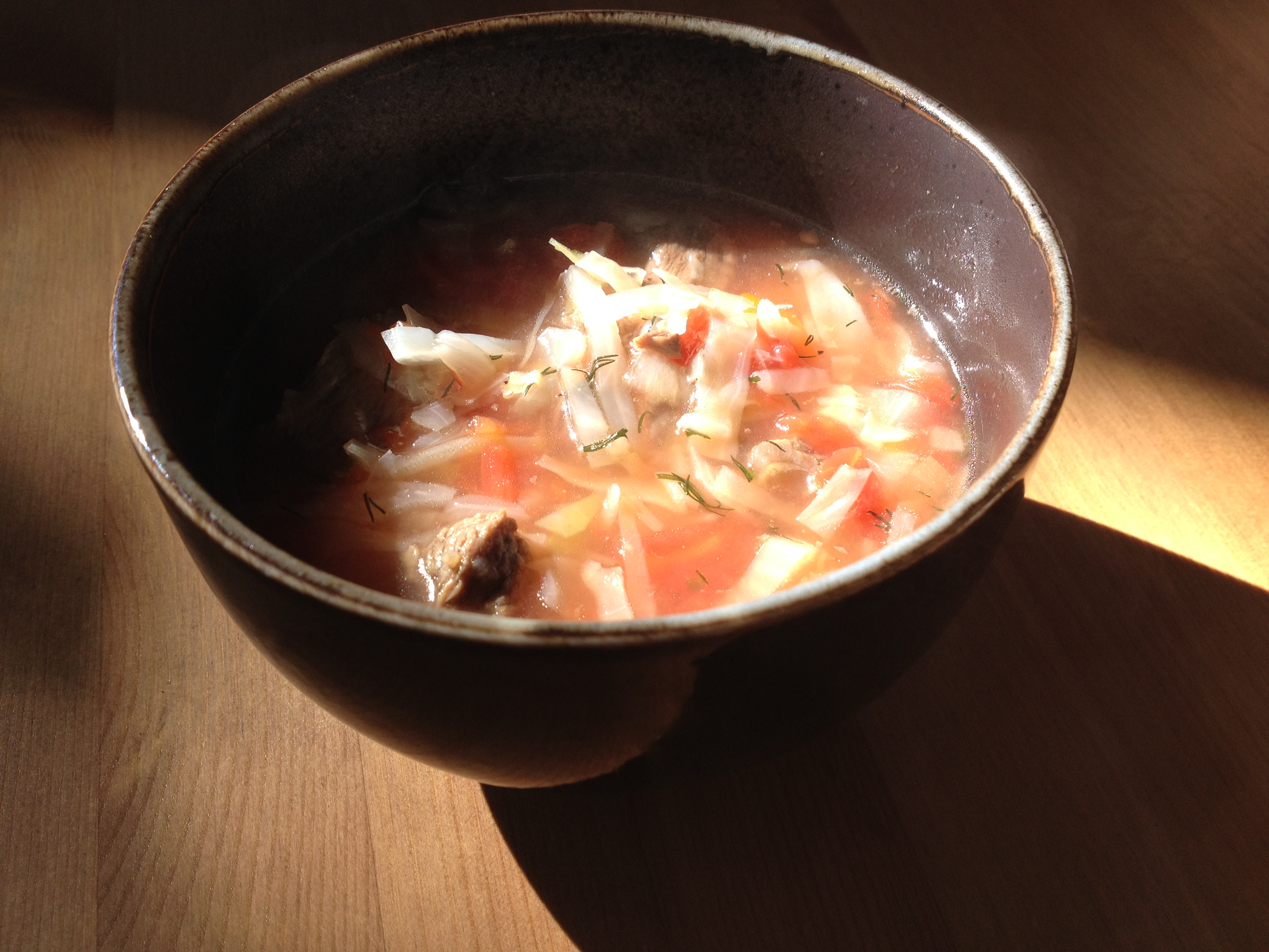 I absolutely love my mom’s borscht, and yet I have never tried to make it. (Update – oops, this isn’t actually her recipe! This one is good too, but here’s the link to the real deal.) There’s something special about having her make it, and then give me some in a jar to take home.  But I thought I should figure out how to make it, because one day, in a long long time, she’s not going to be making it any more.  Her recipe is from the old “Mennonite Treasury of Recipes,” in which the Mennonite ladies from across Canada contributed recipes.  The first printing was in 1961, and reprinted every year after. Until at least 1975 when mine was printed.  I had it handed down to me by a great-aunt.  The original recipe is called “Cabbage Borscht,” and it includes potatoes, which I left out.  I wanted to freeze some, and I don’t think potatoes freeze well.  I also prefer the taste  it without them. I also use yogurt for putting on top, rather than the cream the recipe calls for.  I added, like my mom, dill.