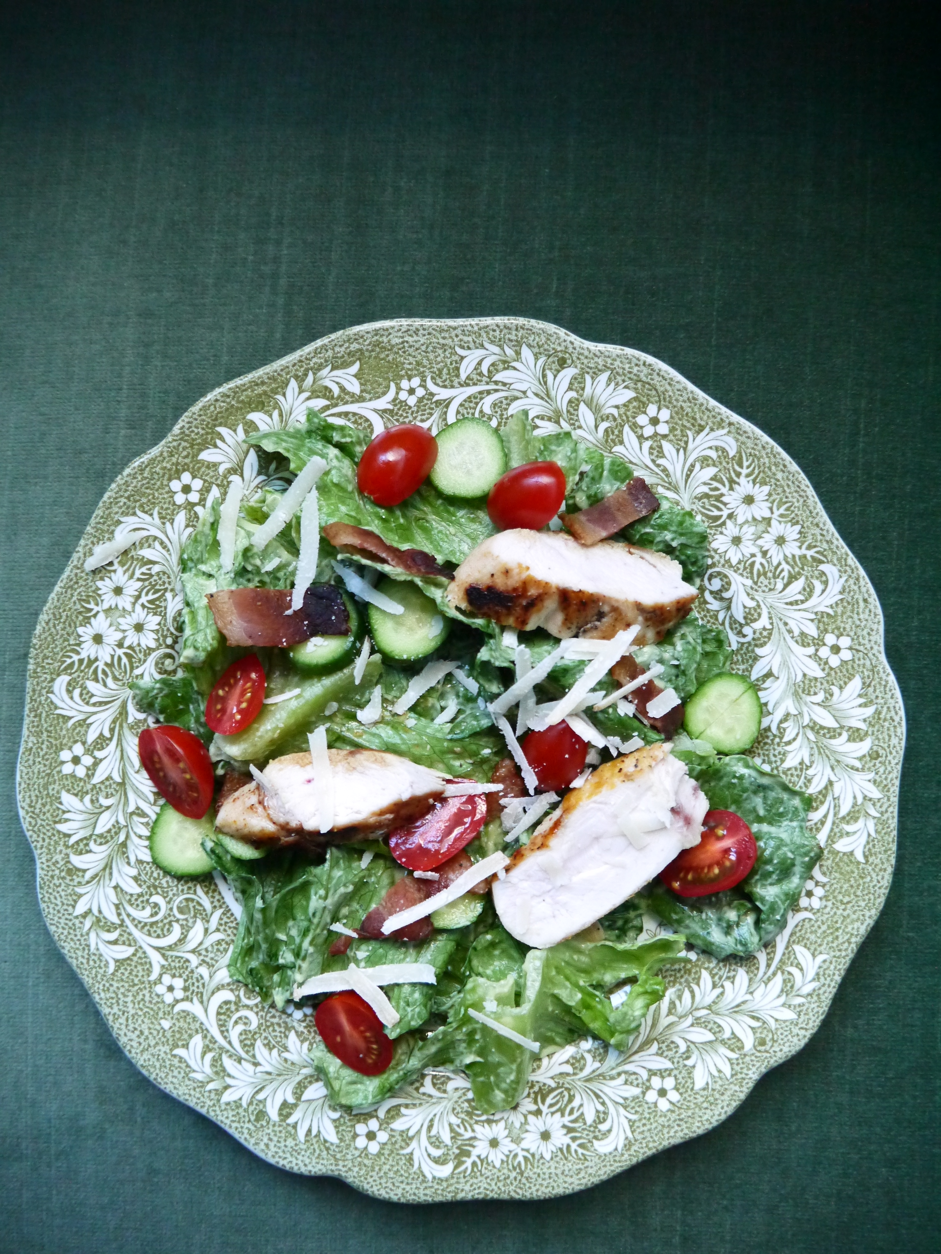 - Break pieces of washed and dried lettuce into a large bowl and add about half of the dressing, mixing until it is all coated. Toss in some tomatoes and cucumber rounds. You can either arrange the salad on a platter, or on individual serving plates: arrange the chicken on top, then crumble some bacon on top, along with some Parmesan.