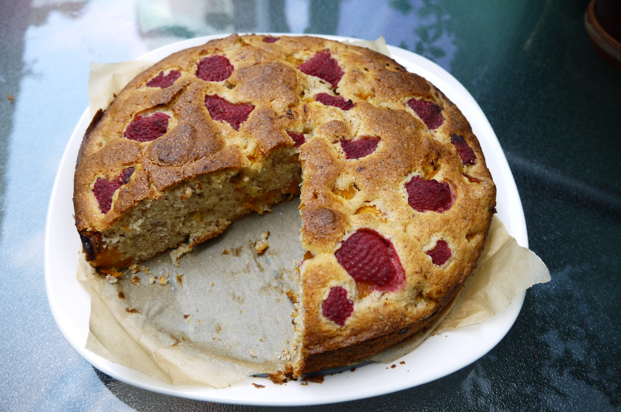 If speed of consumption is any indication, then this cake is a favourite – it disappeared in 5 minutes flat at the potluck I brought it to this afternoon.  And I can see why (although I didn’t get to try it) – a light almond cake with apricots and raspberries; how could that not be good? Perfect served still warm from the oven, and might even be nice with a little vanilla ice cream.
