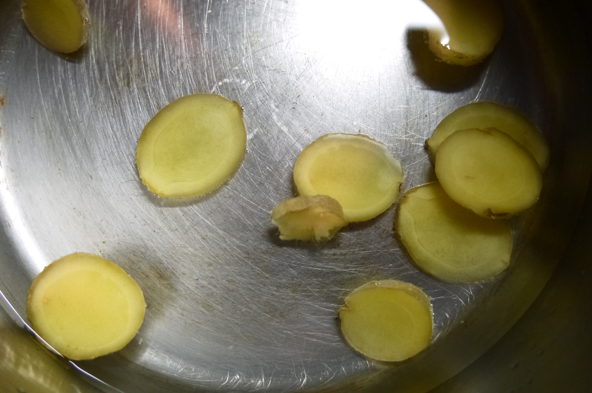 2. Add about a dozen slices of ginger to the water and bring to a boil. Simmer for about 10 minutes.