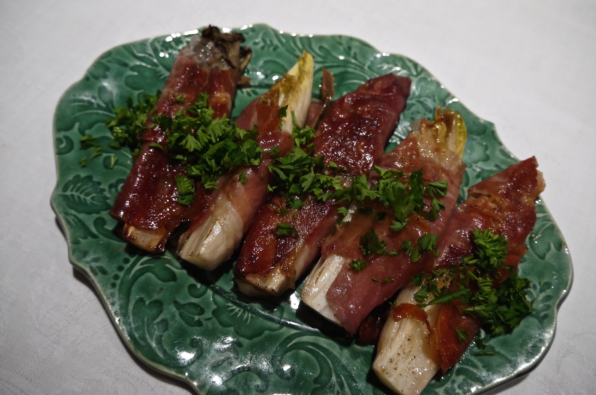 prosciutto wrapped grilled endive - trust in kimThese prosciutto-wrapped endive are a super easy, super delicious appetizer. I made it for a French roasted duck dinner recently, and it was a tasty way to start a meal with an aperitif of Lillet and sparkling water.