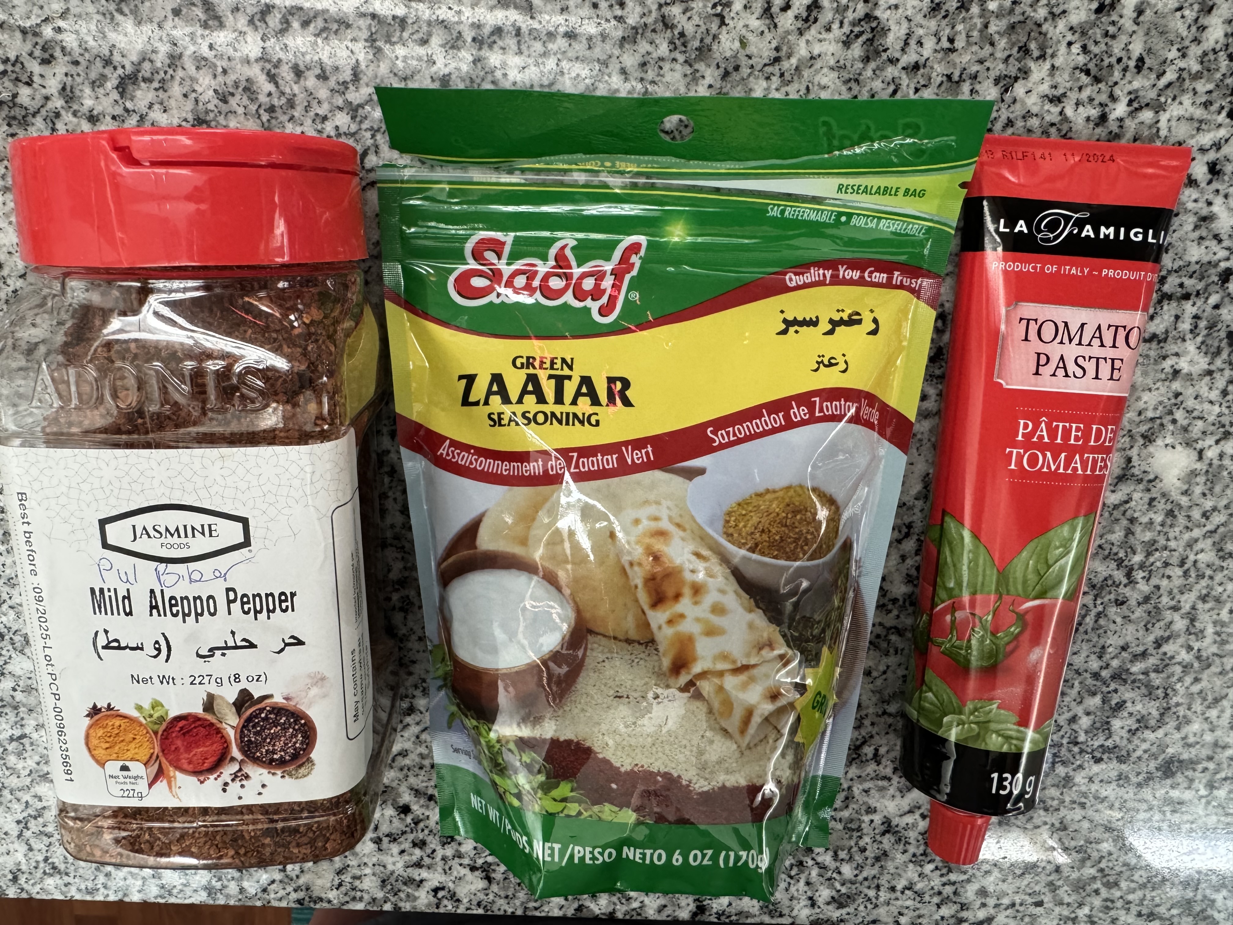 photo showing three packages of food: a dark red ground pepper labelled "mild Aleppo Pepper" with the brand name "Jasmine," a bag  labelled "green zaatar seasoning" with the brand name "Sadaf," and a tube of tomato paste with the brand name "la famiglia."