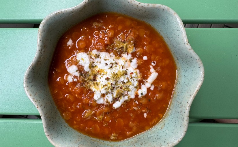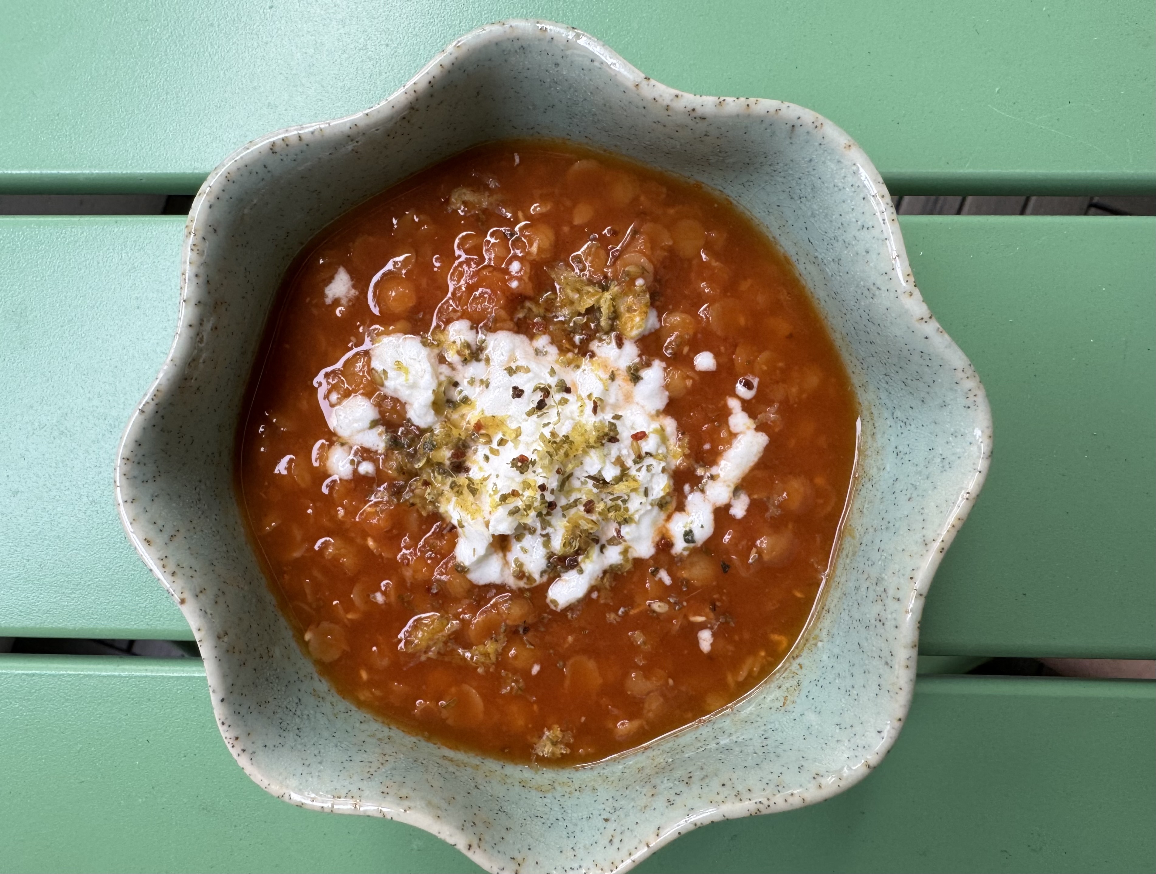 a photo of a bowl of soup. It is tomato red with lentils in it, and has crumbled goat cheese, herbs and lemon zest on top.