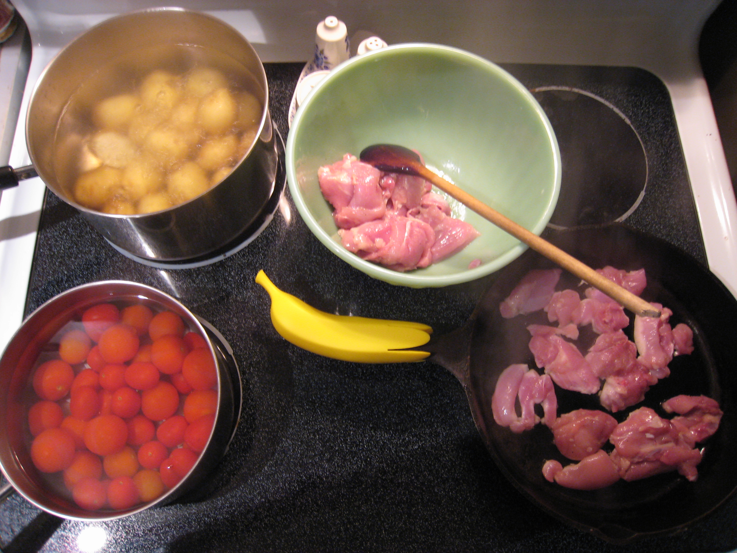 In honour of the rare mid-April snowfall we experienced in Vancouver today, I’m posting this fabulous chicken stew recipe. It’s not too hard to make, and it’s full of flavour. I’ve adapted a recipe for veal stew from a Western Living cookbook to make this. Oh, and it’s so tasty if you use homemade stock – it’s pretty much vital to the flavour, so plan ahead and make some stock !