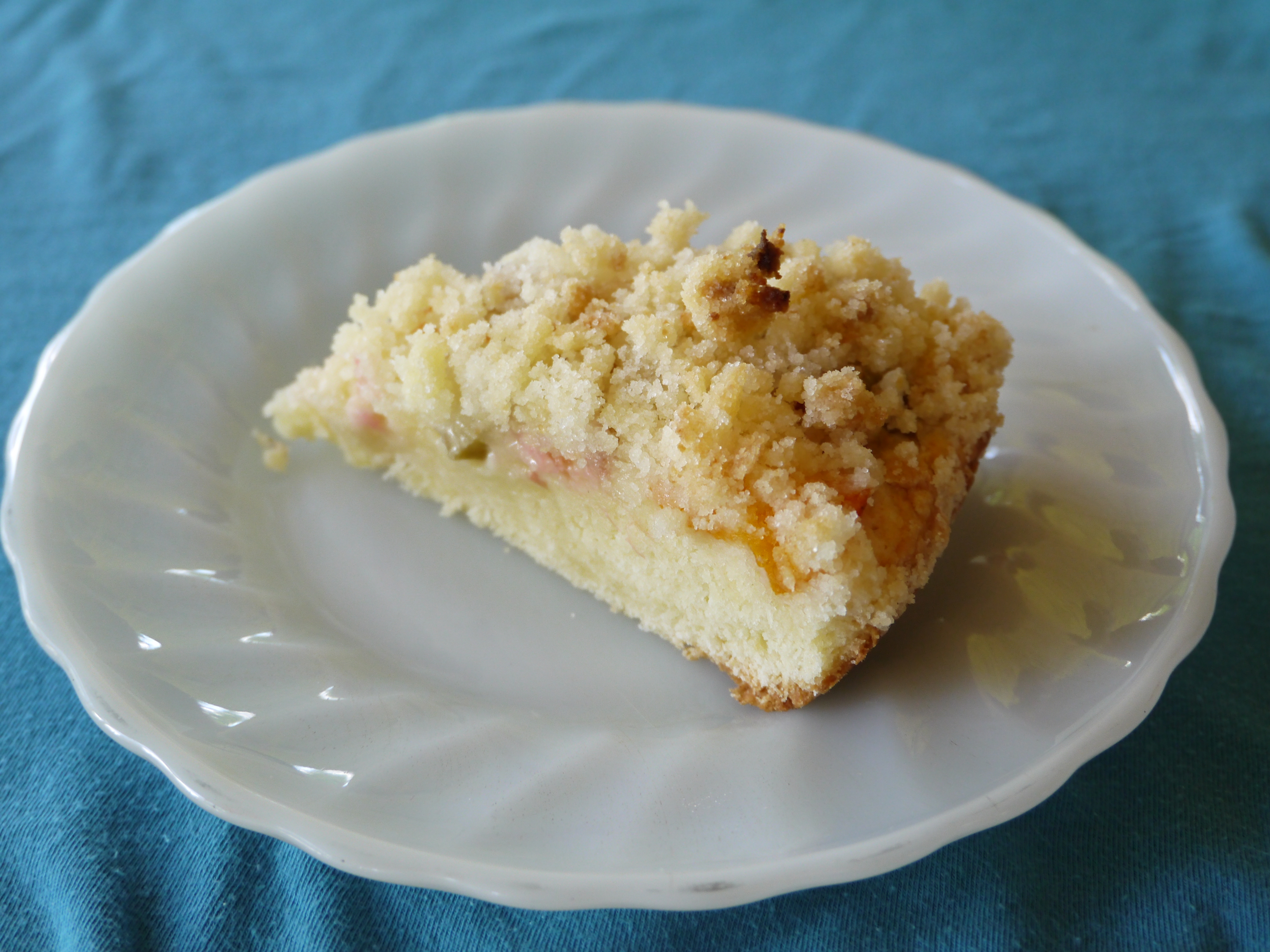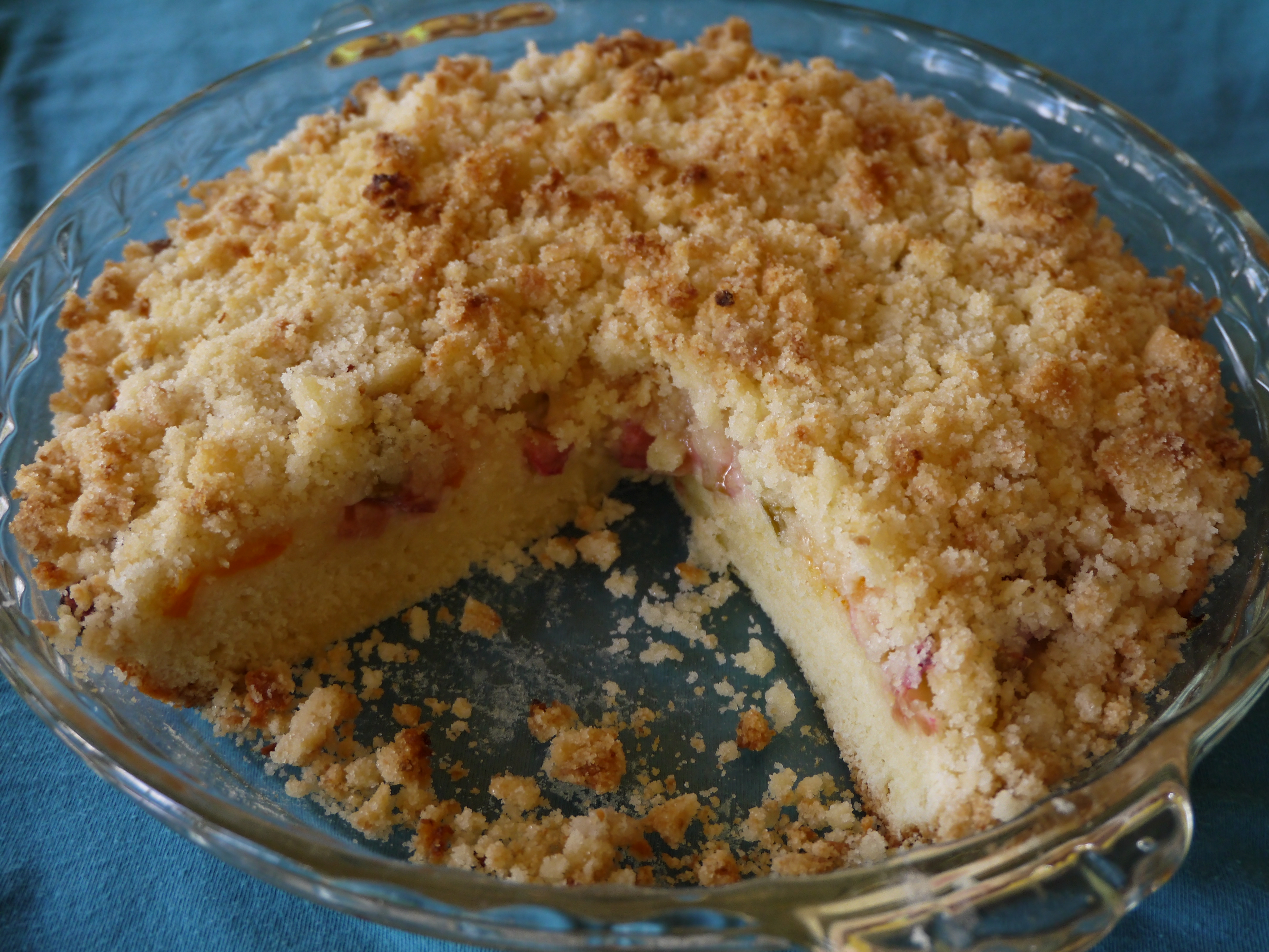 This is a recipe I grew up eating: my Mennonite Mom’s platz. It is a thin coffee cake with fruit and streusel on top. Sometimes on the second day the cake layer would get a bit dried out, but I didn’t mind too much because the fruit and streusel were so yummy. For this recipe I used a combination of rhubarb and apricots, but plums are another favourite.