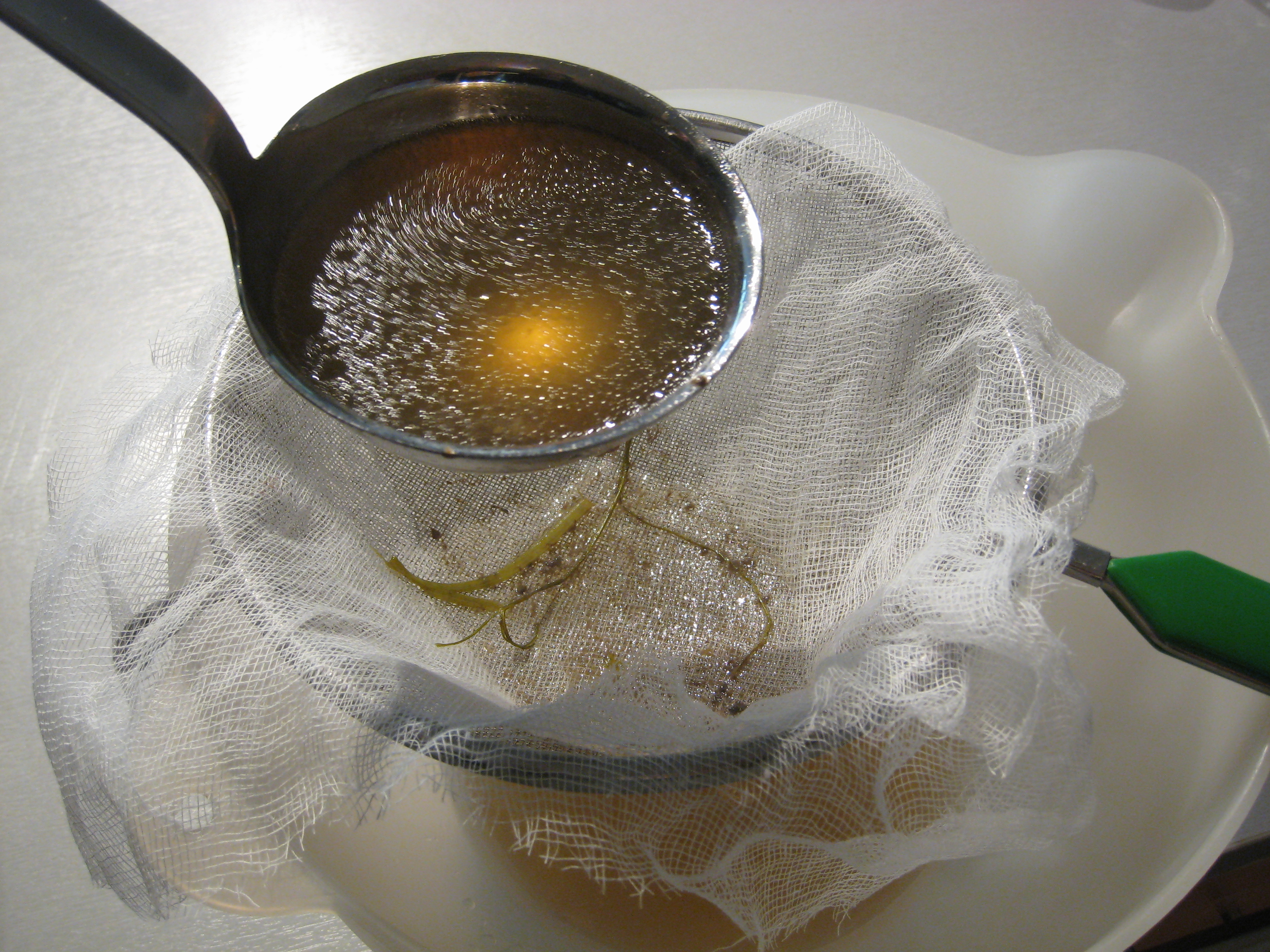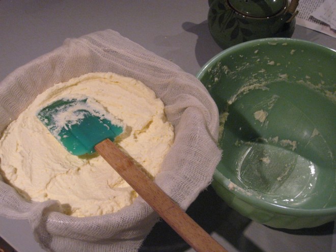3. Line a sieve with cheesecloth and place the spread in there. Cover the top with plastic wrap and allow to drain in the fridge for a few hours. (My mom says this is necessary, but there really wasn’t much liquid that drained out of mine, so I don’t think it’s essential.)