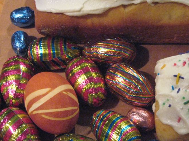 We would typically leave the paska sitting out on a table, surrounded by decorated eggs, just because it looks pretty. But, by Easter morning it would be all dried out – so I recommend storing it in a plastic bag before icing it, then ice it before you’re going to put it out, and cut right before serving. People can slather on as much of the cheese spread as they want – mmmm, so good!