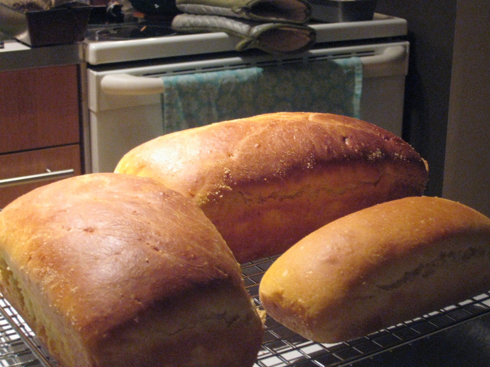 6. Grease two bread pans (or coffee tins) and coat with the bread crumbs. Divide the dough in half and form into a loaf with the edges tucked under, then place them into the pans. The dough should fill the pan about 1/3. Let the dough rise again, covered with the towel, until it just reaches the top of the pan.