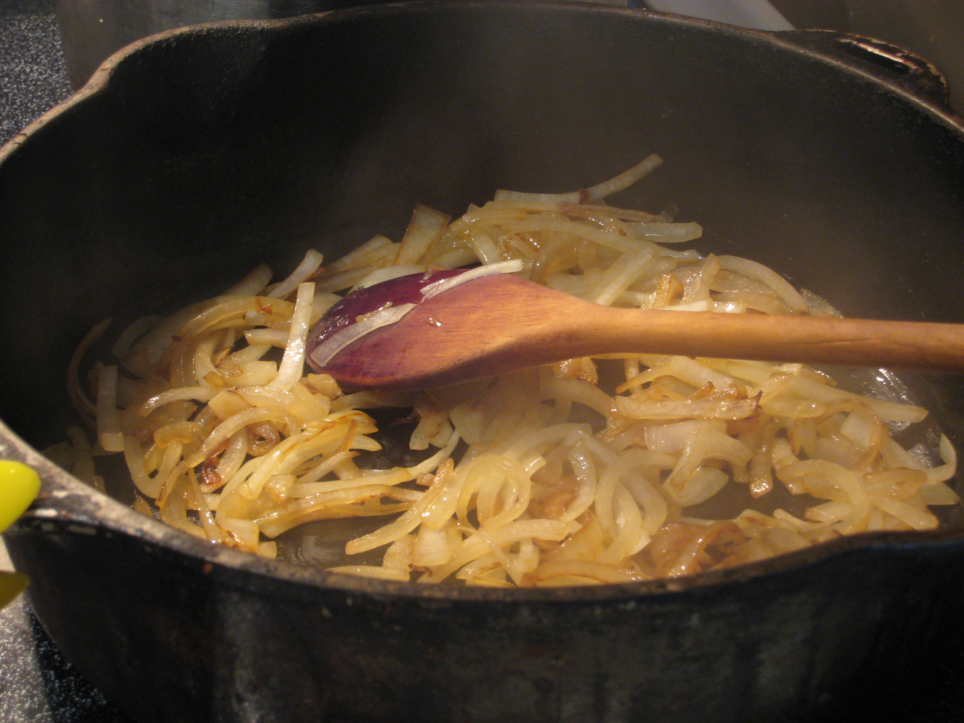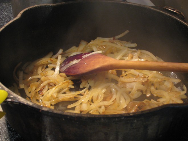 2. While the rice is cooking, get started on the veggies. This won’t take the whole 55 minutes, so you can do other things for a while, then spend 20 or so minutes on the rest of the recipe. First slice the onion into strips that are just less than 1cm wide. In a large frying pan, heat the oil on medium high, then add onions and cook them until they are slightly browned.