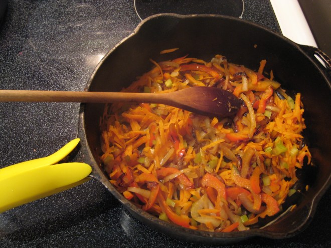 4. Grate the carrot and add to the other veggies. Cook for 5-10 minutes, until the peppers are soft and the onions are quite brown.