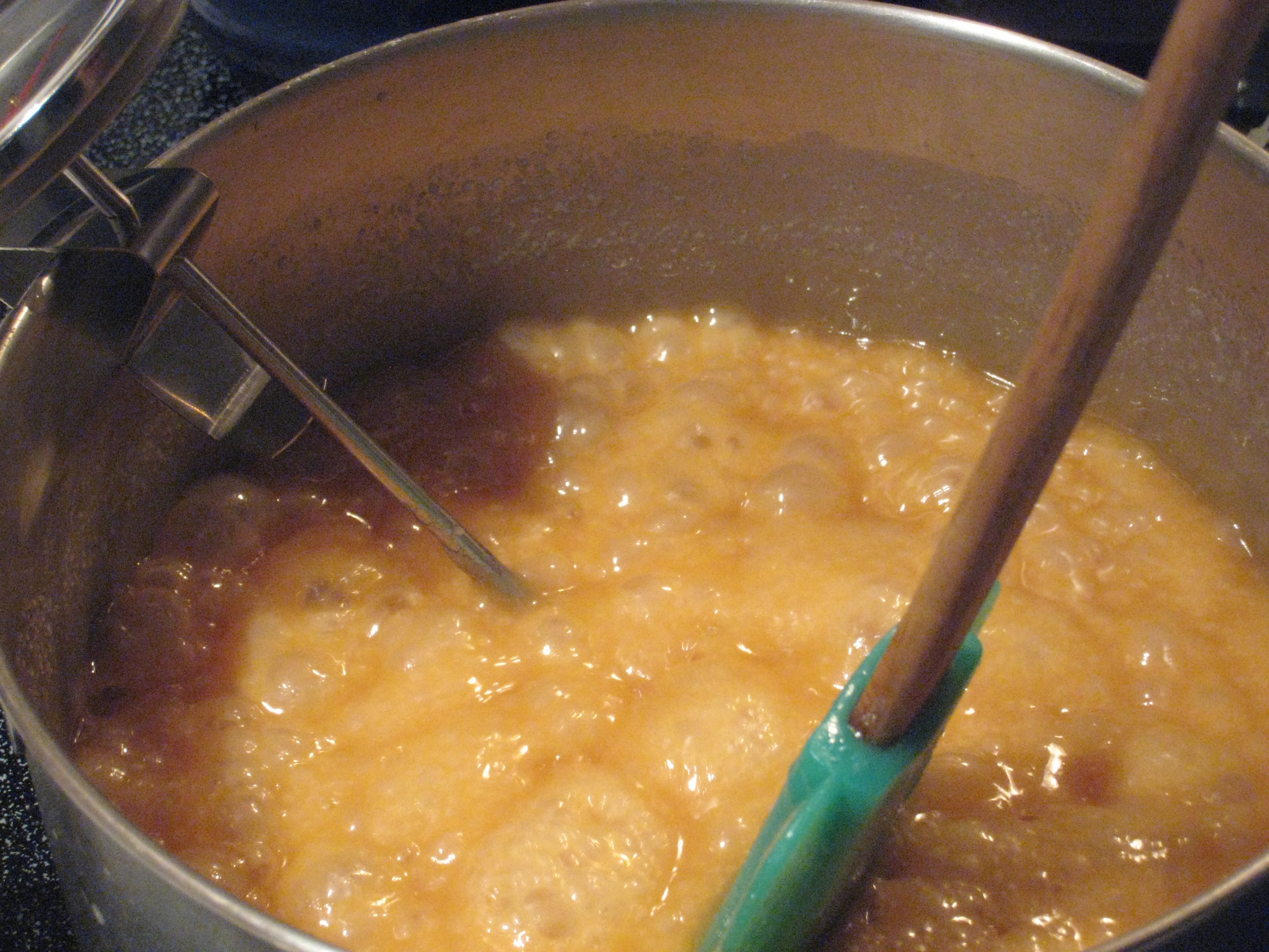 4. For the next steps you need to have patience, as you will be stirring for about 30-40 minutes. Continue boiling over medium-low heat, stirring occasionally. You will begin to see the mixture turn a more caramel-brown colour. If you’ve got a candy thermometer, you want it to read 250F. If you don’t have one, you can get a bowl of ice water and place a drop of the mixture into it. When it forms a “firm ball” in the ice water, take it off the heat right away.