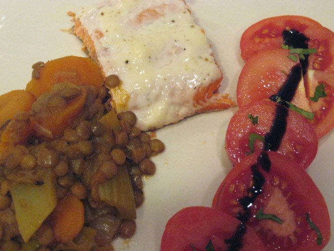 I found the recipe on this site.  I made a few changes, such as browning the onions rather than cooking until translucent, I used white wine in place of some of the chicken stock, and I didn’t add the agave nectar that the recipe called for.  The blogger says that both salmon and lentils help de-stress and balance moods, and provides omega-3 and magnesium.  I sure felt happy after eating it, maybe just because it tasted so good.
