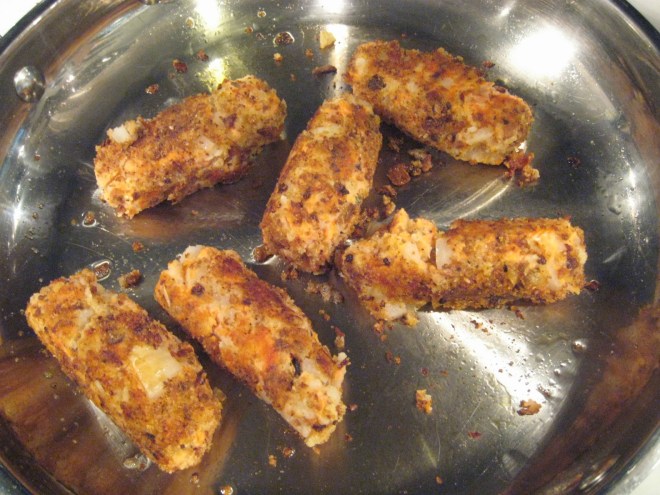 2.  Form into small logs or patties, then coat in bread crumbs.  Place on a rack, then refrigerate for 15 to 20 minutes to dry them out a little.