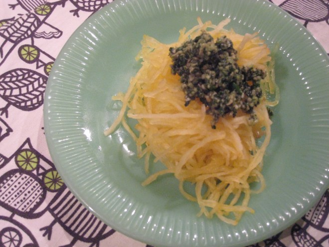 I haven’t made this in ages, but now that I’ve reminded my taste buds, I’ll be making it again soon. This is a twist on traditional pesto, with a base of tomato. It’s so easy to make, and works well on pasta, spaghetti squash, or steamed julienned zucchini, which is pictured.