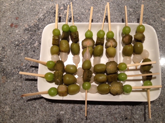 Here’s a yummy, pretty and easy party appetizer.  There’s a mixture of sweet and salty pickles and olives, and a sweet grape to finish it off.