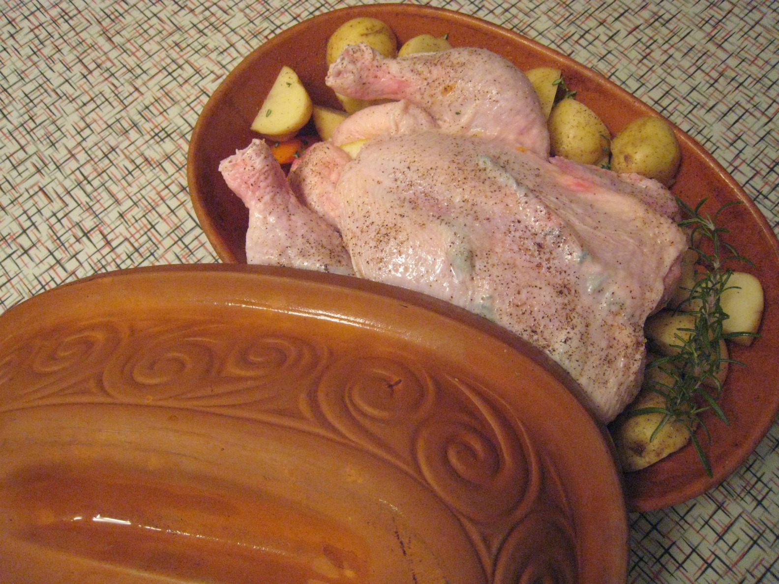 - Place the cover on the roaster, then put it in a cold oven – this is important to prevent the clay roaster from cracking when it goes into a hot oven. Turn the temperature to 4ooF and set the timer for 1 & 1/2 hours. Leave it to roast without peeking; this will help keep all the moisture inside.