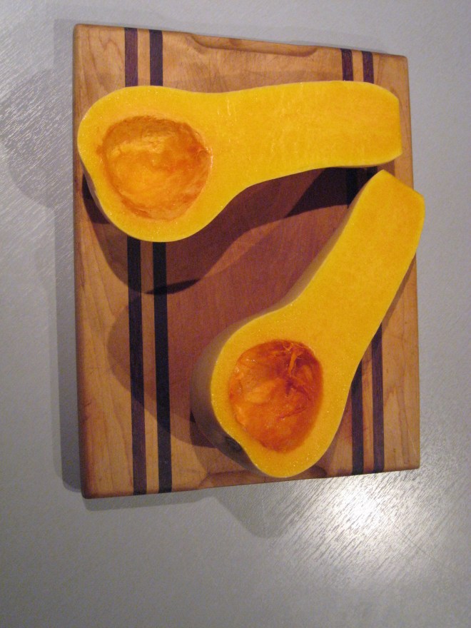 2. Cut the squash in half and remove seeds. Place cut side down on a baking pan. Bake at 375F for 40-45 minutes. Wrap the garlic, in their papery covers, in a small piece of tin foil and place on the same baking sheet.