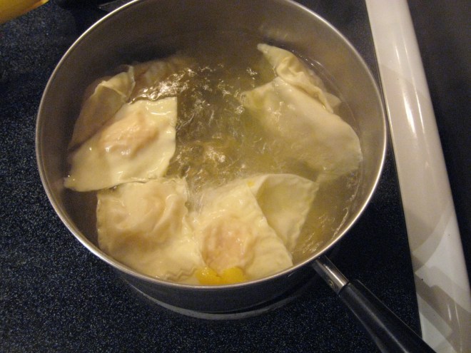 In the end I realized that I’m not very good at rolling the pasta into rectangles, and that it’s hard to seal the ravioli properly. So I ended up with a few tortellini that lost their filling. After making a bunch of difficult and misshapen ravioli I gave up and made a sort of deconstructed ravioli dish – I just put some hot filling on the plate, then topped it with some long strands of pasta, salt and pepper and a bit of butter. Same amazing flavour, way less work! You could just make the filling and use some store-bought pasta – much much simpler!