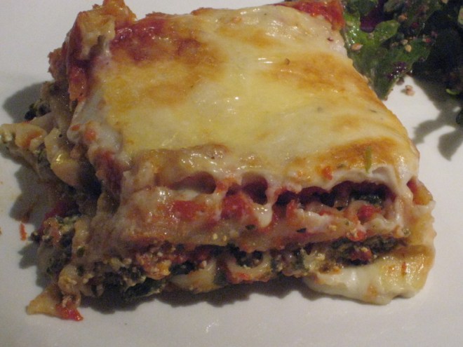 2. You have all the parts ready to assemble the lasagna, so now you just have to build it. This is the layering I did – of course you can experiment with this to make it your own. If you are using no-boil noodles you just have to make sure you have enough moisture to cook them, or they will be a little crunchy around the edges. Use a 9×12 pan for this amount of lasagna.