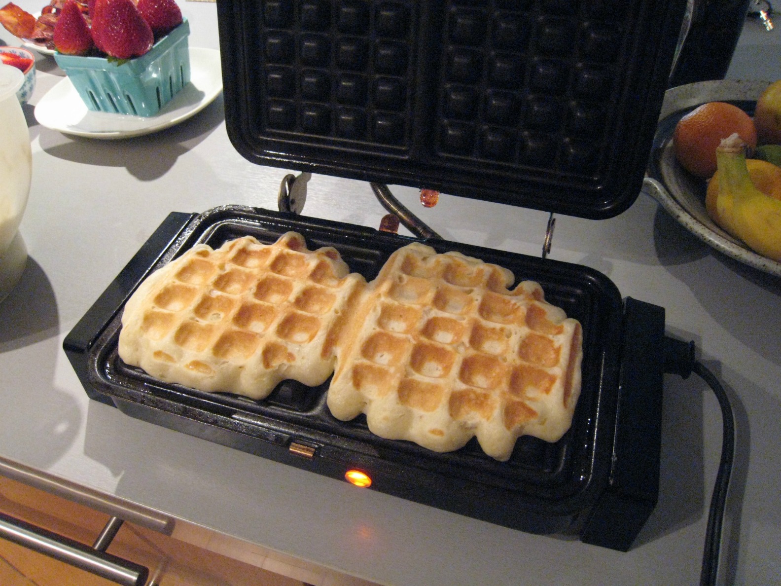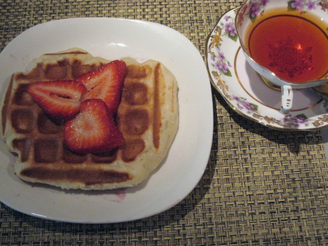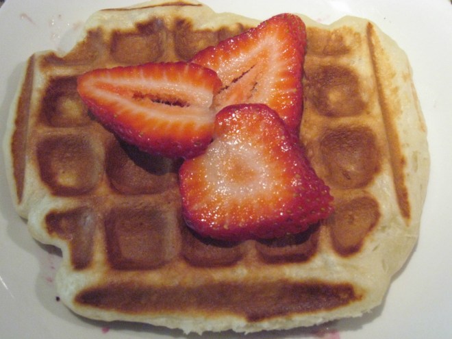 I’ve made lots of waffles before, but I wanted to try something new for a birthday brunch. I saw a few recipes online about yeast-raised waffles and figured I could try that out. I balked at the amount of butter the recipes called for, so I cut back on it a little. They are not difficult to make, but you need to plan ahead as you need to let the batter raise for about an hour before you want to use it. This recipe is huge – I think it made more than 15 waffles.